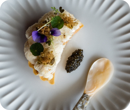 Nejde tedy primárně o chuť, ale o práci s texturou a vizuálním kontrastem. Proti tomu stojí kaviár jako výrazná ingredience, která celý pokrm propojuje a dává mu charakter.