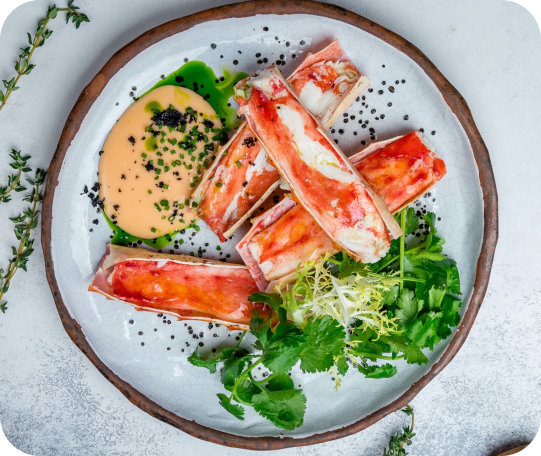Krab královský: Maso tohoto kraba je šťavnaté, bohaté a křehčí než maso kraba sněžného. Má jemně nasládlou chuť a delikátní strukturu, kterou někteří přirovnávají k humrovi. Maso z krabích stehen je velké a vydatné, což z něj činí luxusní a nezapomenutelný zážitek.