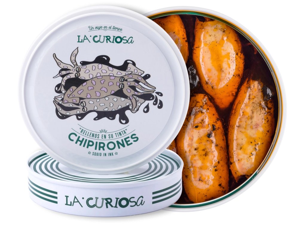 Balení dvou konzerv značky La Curiosa. Jemné sardinky v olivovém oleji a baby kalamáry ve vlastní šťávě s inkoustem pro nevšední gurmánský zážitek.