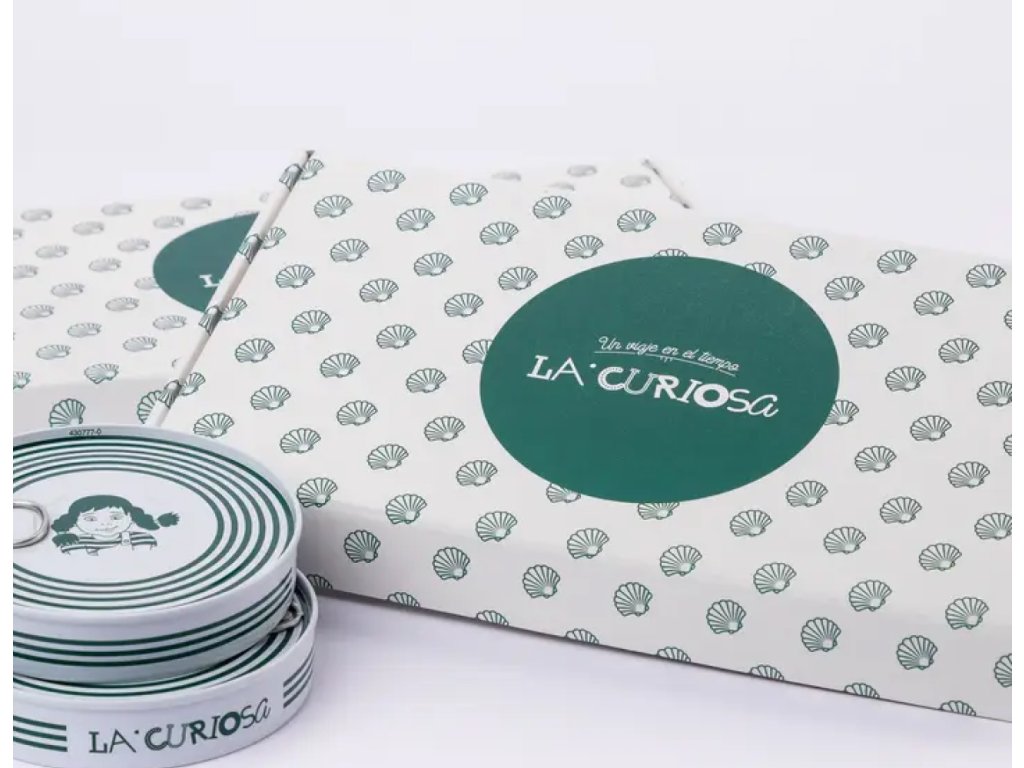 Balení dvou konzerv sardinek značky La Curiosa. Jemné sardinky v olivovém oleji a varianta s pikantní chutí
