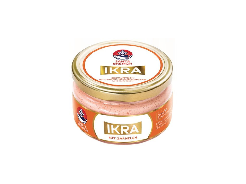 Složení:Slaná jikra z huňáče 42 % (jikry z huňáče, sůl), slunečnicový olej, pitná voda, maso krevet vařené 8 % (maso krevet, sůl), cukr, aroma, sušený žloutek, bramborový škrob, zahušťovadlo xanthanová guma, sušené odstředěné mléko, barviva: karmín pravý, paprikový extrakt; okyselovadlo kyselina octová.
