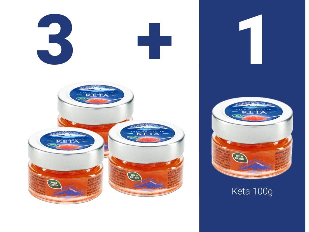 Set 3 + 1 s lososovým kaviárem keta představuje výhodné balení šesti sklenic oblíbeného kaviáru, z toho jedna je zdarma. Je to skvělá volba pro zákazníky, kteří si potrpí na výraznější chuť divokého lososa a ocení velké, zlatavě oranžové jikry, které jsou typické pro tento druh.
