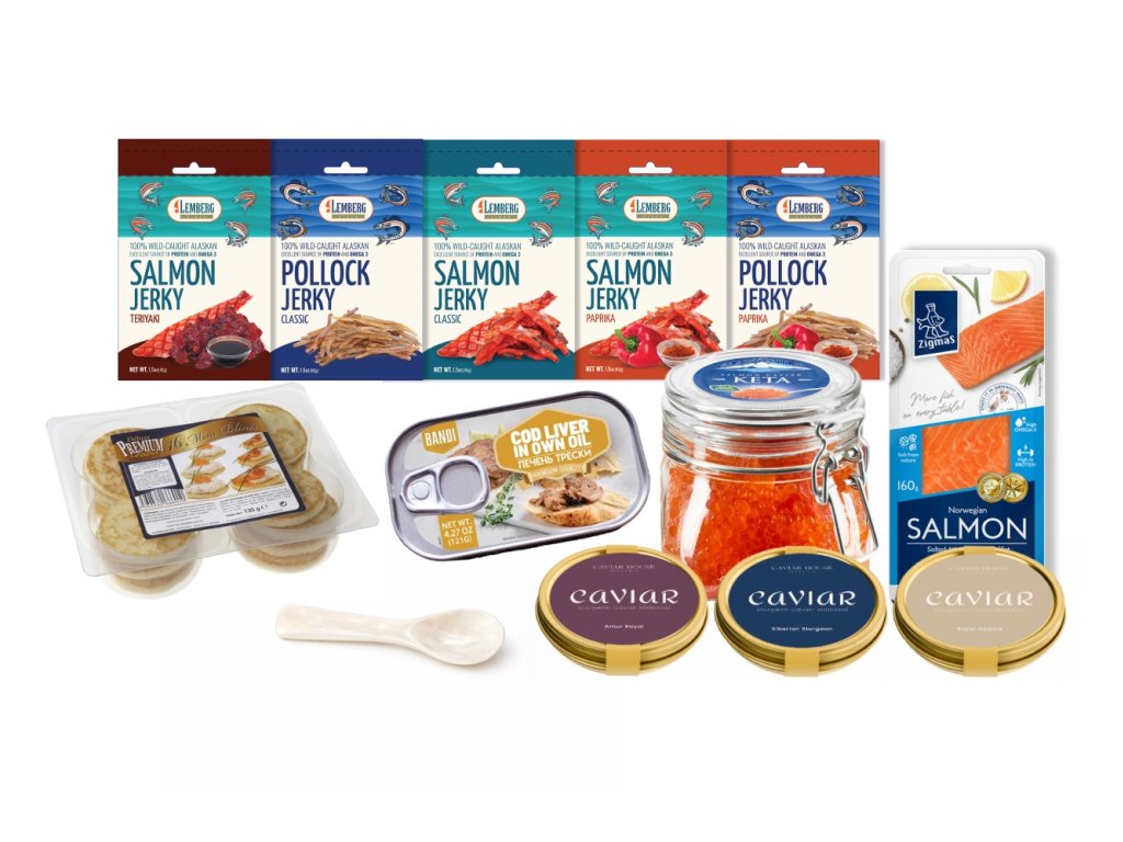 Dominantou setu je lososový kaviár Keta ve větším balení, který skvěle doplní tradiční blinis a vytvoří tak jednoduché, ale působivé sváteční pohoštění. Nabídku dále rozšiřují lehce solený losos Gravlax a tresčí játra s plnou chutí, které se výborně hodí na čerstvé pečivo nebo jako součást studeného talíře. Pro milovníky výraznějších snacků set obsahuje také výběr sušených ryb jako jsou jerky z divokého lososa Nerka v několika variantách i sušenou tresku.